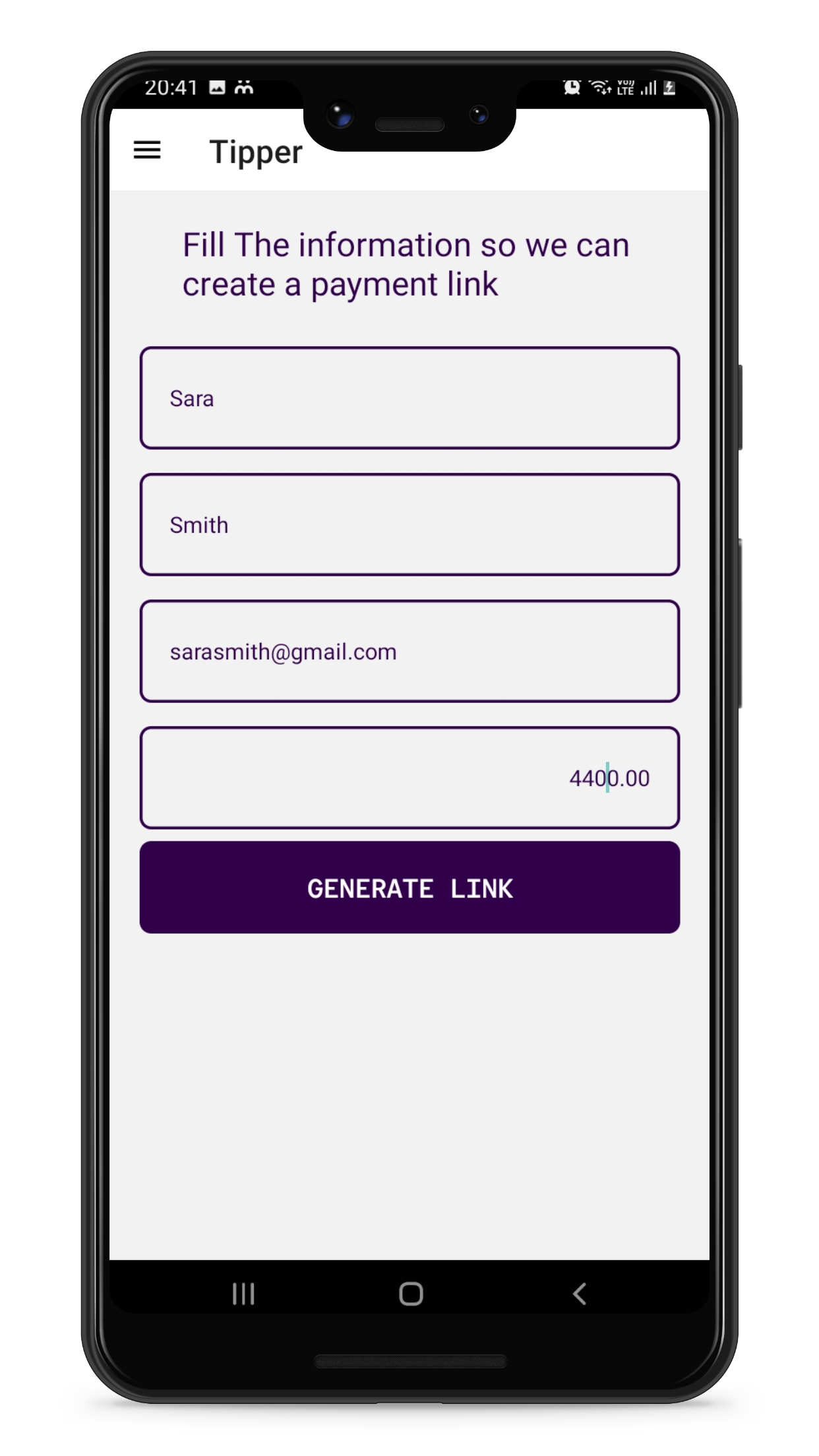 Generate a payment link and send to someone you want to get paid. First enter their name, email and amount you wanna get paid in